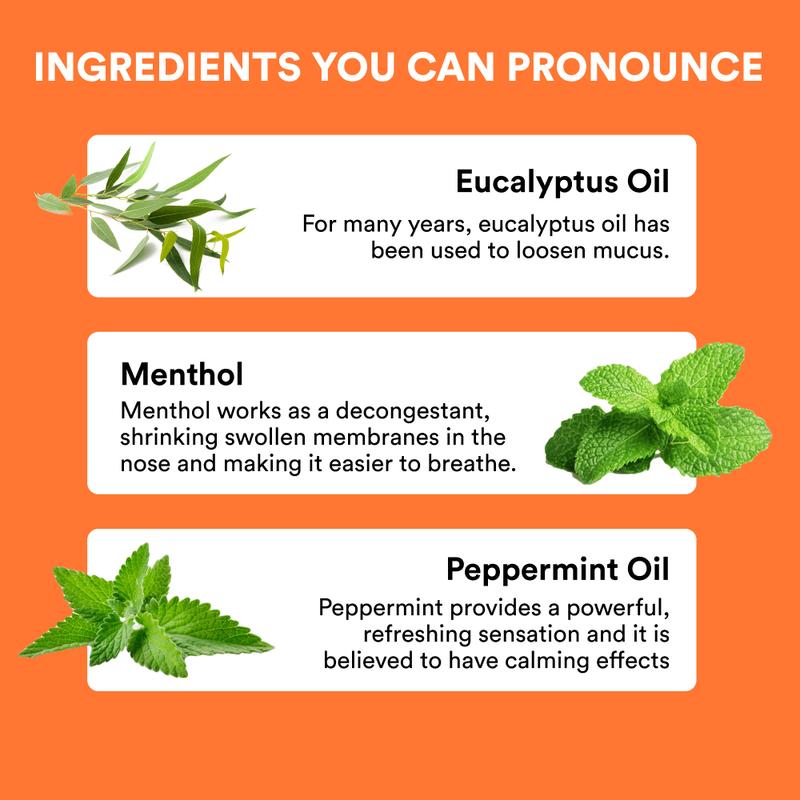 • Ingredients: Menthol,Eucalyptus Oil, Peppermint Oil, Spearmint Oil, Lavender Oil,Lemon Peel Oil, Orange Peel Oil, Wintergreen Oil